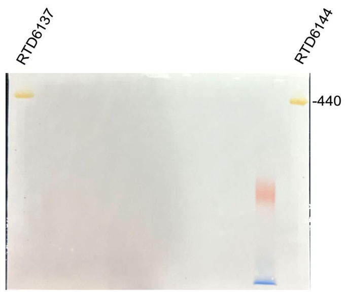 3. 非變性蛋白電泳Marker(RTD6137,RTD6142,RTD6144)由于要保持蛋白的天然結(jié)構(gòu),都沒(méi)有偶聯(lián)染料,在電泳時(shí)基本都看不到條帶;然而,RTD6137和RTD6144中的440 kD和880 kD由于天然蛋白中含有鐵離子,使得電泳后在膠上可見(jiàn)淡黃色,其中440 kD顏色更深。凝膠轉(zhuǎn)膜后,膜上也可以看到黃色的440 kD條帶(下圖),可以大體判斷Marker轉(zhuǎn)膜的效果。