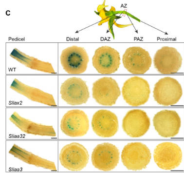 鑒于 SlGATA6 調(diào)控生長素運(yùn)輸載體 SlLAX2的表達(dá),該研究通過生長素特異性抗體的免疫熒光雜交技術(shù)及離區(qū)組織切片分析,在細(xì)胞層面揭示了生長素的空間分布模式,首次實(shí)現(xiàn)了生長素梯度的空間維度解析,證實(shí)了 SlGATA6 是維持這一梯度的關(guān)鍵。通過免疫熒光雙標(biāo)試驗(yàn)發(fā)現(xiàn),SlIAA3 與 SlIAA32 蛋白信號(hào)強(qiáng)度在遠(yuǎn)軸端到近軸端方向呈現(xiàn)相反的分布規(guī)律,即遠(yuǎn)軸端 SlIAA32 信號(hào)強(qiáng),SlIAA3 信號(hào)弱,近軸端則反之。值得注意的是,SlIAA32 和 SlIAA3 的總信號(hào)強(qiáng)度由遠(yuǎn)軸端到近軸端顯著減弱,形成了離區(qū)生長素的信號(hào)梯度。由于 SlIAA32 和 SlIAA3 均可以提高生長素信號(hào),且破壞 SlIAA32 和 SlIAA3 的功能都能夠?qū)е律L素信號(hào)嚴(yán)重受損,表明 SlIAA32 和 SlIAA3 是建立生長素響應(yīng)梯度的關(guān)鍵因子。