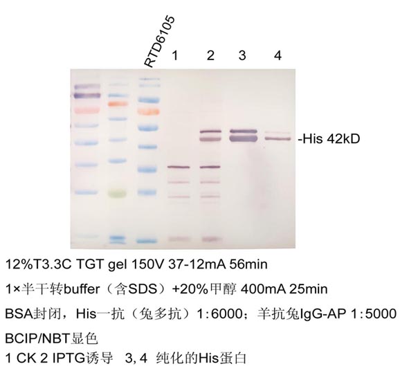 1.2 將印跡膜完全浸入到適量BCIP/NBT 顯色液中,常溫避光孵育 10-20 分鐘,至膜上條帶清晰可見(jiàn)。顯色完畢后,將膜浸入水中,終止反應(yīng)。