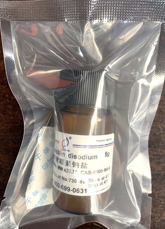 Carbenicillin disodium is a semi-synthetic β-lactam antibiotic that is related to penicillin. Its bactericidal mode of action is analogous to that of benzylpenicillin, which acts on bacteria by inhibiting bacterial cell wall synthesis. Relative to benzylpenicillin, carbenicillin has a relatively greater spectrum of activity against Gram-negative bacteria such as Pseudomonas aeruginosa, but a lower activity against Gram-positive bacteria. Commonly used for the elimination of Agrobacterium species after inoculation.