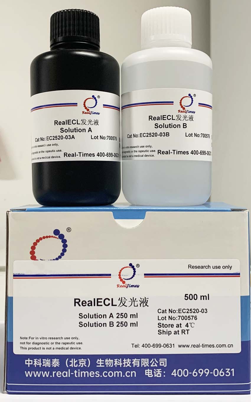 RealECL 是一種超敏ECL化學(xué)發(fā)光試劑盒,可與二抗上耦連的辣根過氧化物酶(HRP)發(fā)生化學(xué)反應(yīng),發(fā)出熒光,從而可以通過用X光片壓片或其它適當(dāng)熒光成像設(shè)備檢測樣品。RealECL具有極高靈敏度和高信噪比,可檢測出10-100 fg的微量抗原;發(fā)光迅速,熒光可使X感光膠片感光達(dá)1小時以上,特別適用于痕量蛋白檢測;另外高靈敏度可以大大節(jié)省寶貴的樣品以及非常昂貴的一抗和二抗的用量,降低實驗成本。