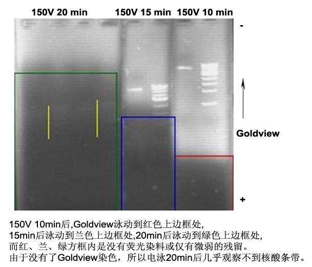 注:預染法,Goldview染色會出現(xiàn)陰陽膠現(xiàn)象,即隨著電泳時間延長,較小的片段會染色不清楚,(參見實驗示例),此時可以將凝膠用后染法染色即可看到小片段條帶。