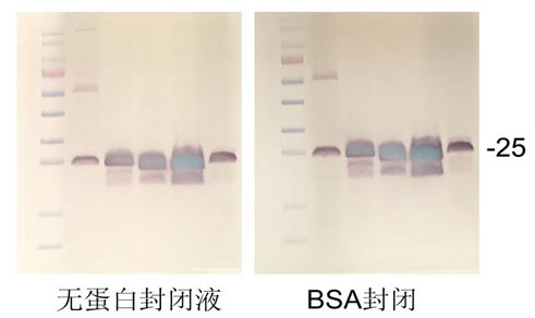 注意:使用本產(chǎn)品,PVDF膜和NC膜使用推薦封閉時間,經(jīng)多種抗體的測試封閉效果顯著優(yōu)于常規(guī)的BSA封閉1 h。對于一些背景非常高的抗體,可以嘗試延長封閉時間。如有特殊需要,也可4℃封閉過夜。
