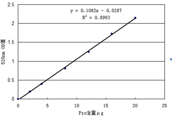 以系列脯氨酸標準(1-8號管)含量(μg)為橫坐標,以對應的吸光度為縱坐標,制作標準曲線,根據(jù)測定管的吸光度進而計算其脯氨酸含量。