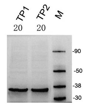 轉(zhuǎn)膜:NC膜,1×RealBlot快速轉(zhuǎn)膜液濕轉(zhuǎn),穩(wěn)流400 mA,電壓變化64-57 V,轉(zhuǎn)膜時(shí)間35 min