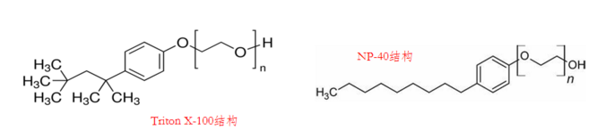 離子型去污劑:非離子型去污劑和離子型不同,它們的頭端基團(tuán)是沒有極性的親水基團(tuán),是比較溫和的表面活性劑。它們可以破壞蛋白質(zhì)-脂質(zhì)以及脂質(zhì)-脂質(zhì)之間的連接,但是不能破壞蛋白質(zhì)-蛋白質(zhì)的連接,而且大多非離子去污劑不能使蛋白質(zhì)變性。因此,這種去污劑可以使蛋白質(zhì)溶解和分離,但卻保留了蛋白質(zhì)的天然構(gòu)象、功能以及它們的相互作用。如Triton X-100、乙基苯基聚乙二醇(NP-40)、Tween-80等。