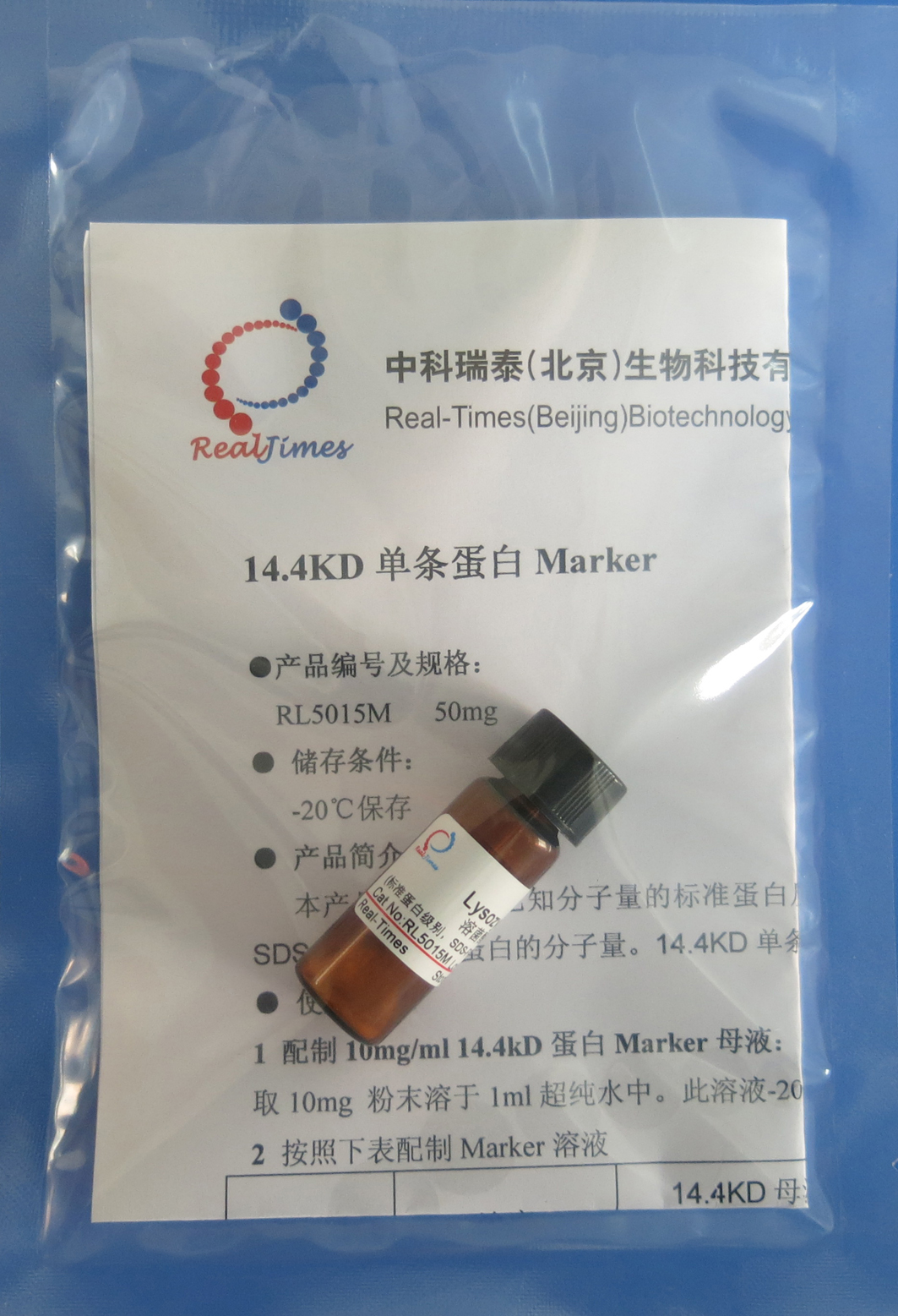 本產(chǎn)品包含一種已知分子量的標(biāo)準(zhǔn)蛋白質(zhì),分子量大小為14.4 kD,可以用來(lái)判斷 SDS-PAGE未知蛋白的分子量。14.4KD單條蛋白Marker 以干粉狀態(tài)提供。以每次上樣10 μl(2 μg)計(jì)算,本產(chǎn)品可以使用約25000次。