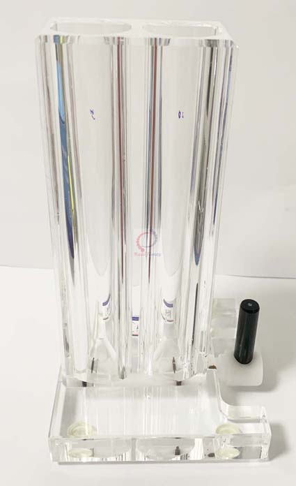 梯度混合儀能使盛放濃縮、稀釋溶液的兩杯液位保持平衡?兩杯溶液混合速度以及輸出流量均可調節(jié)?且可做出各種不同斜率的線形梯度。使用時接近出口的杯體盛放低濃度的液體,遠離出口的杯體盛放高濃度的液體。與多板制膠器配合使用時,比如制作4-20%梯度膠時,接近出口的放4%的溶液,遠離出口的放20%的溶液。
