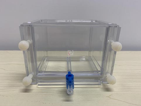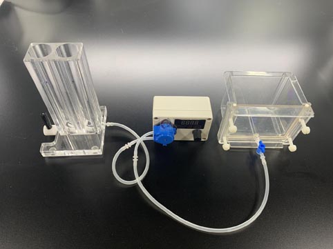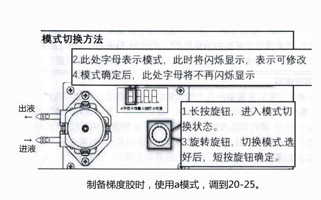 檢查無誤后,打開蠕動泵,使用a模式,調(diào)節(jié)數(shù)字為25,開始灌膠操作。至多板制膠器中的溶液至頂部接近溢出時,首先關(guān)閉多板制膠器藍色閥門(旋鈕與硅膠管垂直為關(guān)閉);