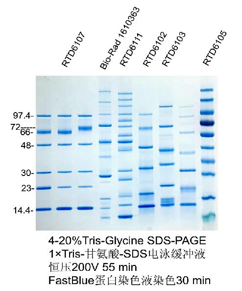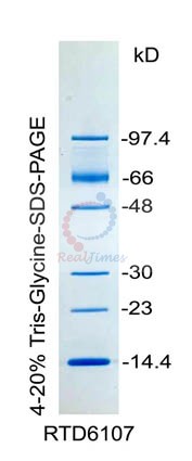 本產(chǎn)品包含6種已知分子量的標(biāo)準(zhǔn)蛋白質(zhì)組成,分子量范圍為14.4-97.4 kD,可以用來判斷 SDS-PAGE未知蛋白的分子量。本產(chǎn)品為非預(yù)染蛋白Marker,電泳后需要染色后觀察條帶。