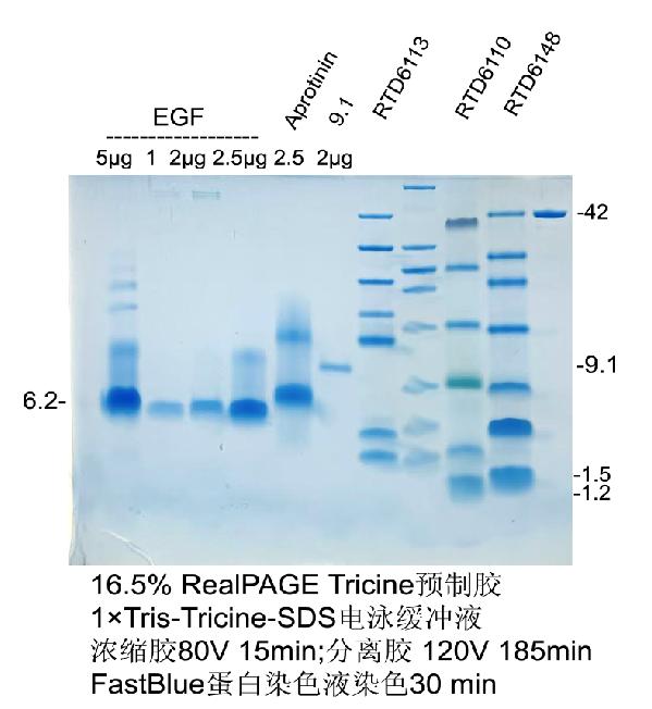 RealPAGE Tricine預(yù)制膠可以用來(lái)檢測(cè)2.5-40 kD的多肽大小。預(yù)制膠玻璃板尺寸10×8.2 cm,凝膠尺寸8.2×7.2 cm,凝膠厚度1.1 mm,梳子12齒,最大上樣體積30 μl,兼容伯樂(lè)電泳槽。