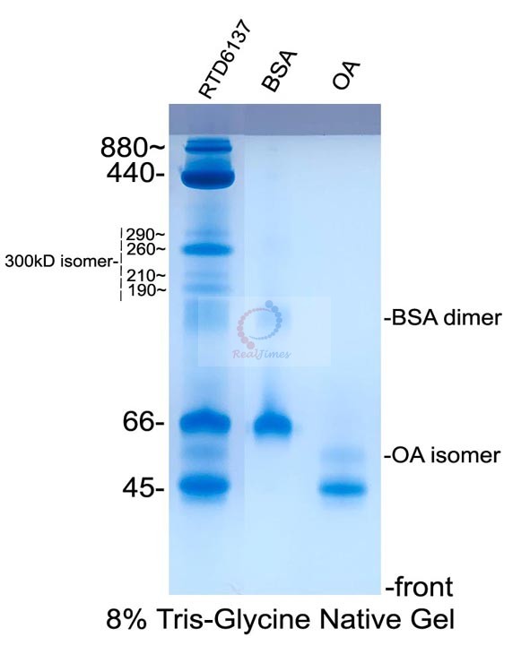 本產(chǎn)品有4種蛋白組成,分子量范圍為45-880 kD,經(jīng)過非變性電泳后,用考馬斯亮藍染色后可以得到5條主帶。
