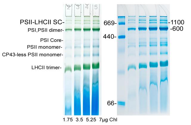 植物類囊體樣品中G250終濃度為去垢劑終濃度的1/4。例如樣品中DDM(n-Dodecyl β-D-maltoside,β-DM, n-十二烷基-β-D-麥芽糖苷)終濃度為2%,則需要G-250終濃度為0.5%。10 μl蛋白樣品中需要加5%
