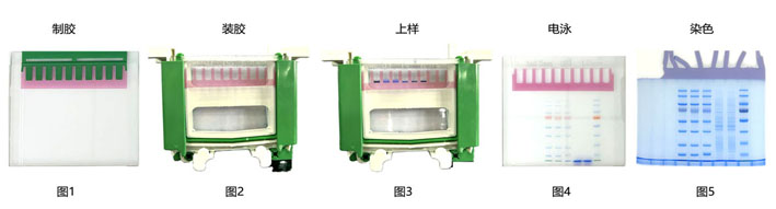 圖1和圖2為使用PAGE上層膠紅色染料配制的上層膠被染成紅色,上樣孔一目了然,易于判斷上樣孔是否歪曲或破損;圖3是上樣后的效果圖,上層膠和樣品非常清晰;圖4為預(yù)染蛋白分子量Marker電泳后的效果,染料保留在上層膠中,不會隨著電泳而遷移;圖5為凝膠染色后的效果,樣品分離清晰,泳道無豎條拖尾,染料不影響電泳結(jié)果。