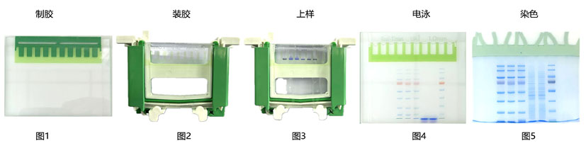 圖1和圖2為使用PAGE上層膠綠色染料配制的上層膠被染成綠色,上樣孔一目了然,易于判斷上樣孔是否歪曲或破損;圖3是上樣后的效果圖,上層膠和樣品非常清晰;圖4為預(yù)染蛋白分子量Marker電泳后的效果,染料保留在上層膠中,不會(huì)隨著電泳而遷移;圖5為凝膠染色后的效果,樣品分離清晰,泳道無(wú)豎條拖尾,染料不影響電泳結(jié)果。