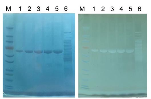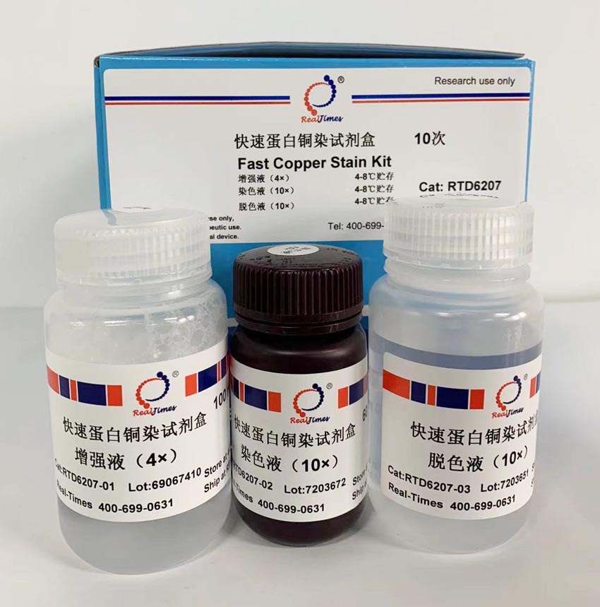 本試劑采用以銅離子為基礎(chǔ)的負(fù)染色方法,用于SDS-PAGE或Native-PAGE電泳凝膠染色,不需要使用含有刺激性的甲醛和冰醋酸,實(shí)驗(yàn)方便快速,可以在30 min左右完成,最低能夠檢測(cè)出2 ng的蛋白條帶,該方法不對(duì)蛋白質(zhì)產(chǎn)生修飾作用,而且經(jīng)過脫色液處理后,可以用于電洗脫或采用PAGE膠蛋白微量回收試劑盒(貨號(hào):RTD8108)進(jìn)行膠回收,以便進(jìn)行質(zhì)譜和測(cè)序分析等,也可以用其他染色方法(銀染或考染)對(duì)膠重新染色。