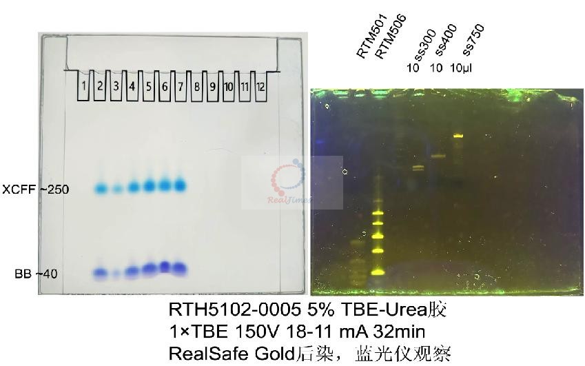 單鏈DNA或RNA樣品可以用單鏈DNA PAGE電泳染色試劑盒(貨號:RTS5103),核酸PAGE電泳染色試劑盒(貨號:RTS5102)或核酸快速高靈敏度染色試劑盒(貨號:RTS5101)染色均可以得到清晰的條帶分離效果。注:如果使用核酸染料染色,RealSafe Red(貨號:GR002)或RealSafe All(貨號:GR004)核酸染料結(jié)合單鏈核酸效果最佳,強烈建議使用以便獲得最佳效果的膠圖。其余染料如GelRed,Goldview,EB等染色效果不好。