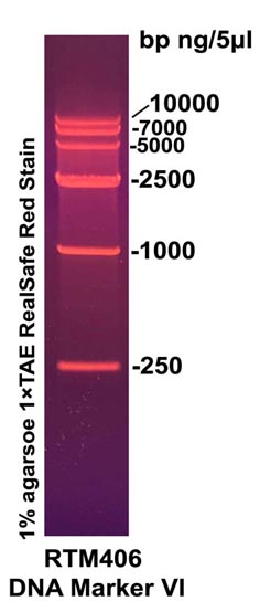 本產(chǎn)品是由6條帶狀雙鏈DNA條帶組成,適用于瓊脂糖凝膠電泳中DNA條帶的分析。產(chǎn)品中已含有1×loading buffer,可根據(jù)實驗需要,直接取2-5μl電泳,使用方便,電泳圖像清晰。6條帶的大小分別為250,10002500,5000,700010000bp。其中2500bp條帶含量為100ng/5μl,顯示加亮帶,其余條帶濃度為50ng/5μl