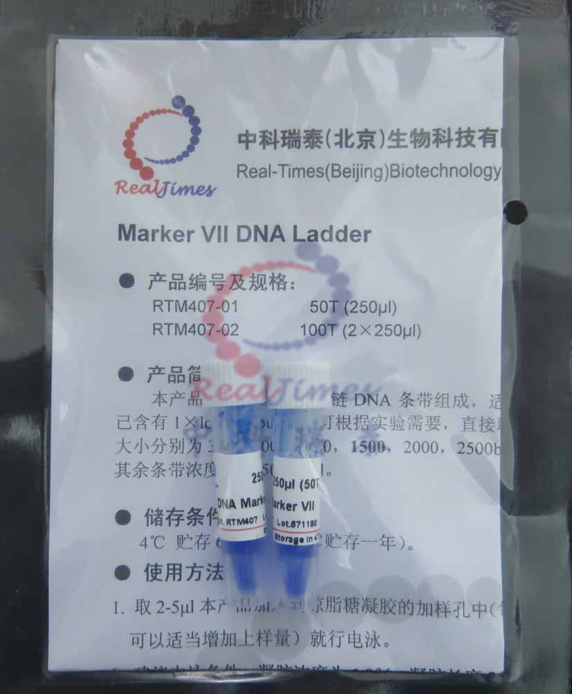 本產(chǎn)品是由6條帶狀雙鏈DNA條帶組成,適用于瓊脂糖凝膠電泳中DNA條帶的分析。產(chǎn)品中已含有1×loading buffer,可根據(jù)實(shí)驗(yàn)需要,直接取2-5μl電泳,使用方便,電泳圖像清晰。6條帶的大小分別為300,500,10001500,20002500bp。其中1500bp條帶約為100ng/5μl,顯示加亮帶,其余條帶濃度大約50ng/5μl。