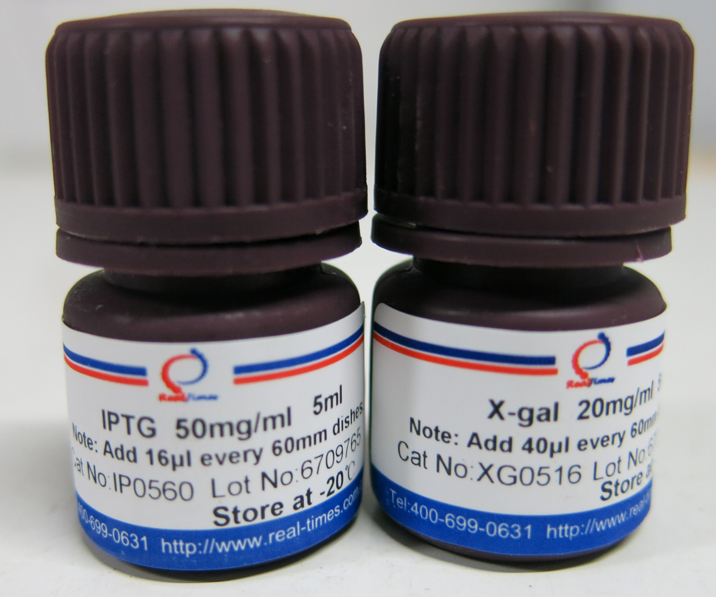 X-Gal 5ml:取100mg X-gal,溶于5ml 二甲基甲酰胺(DMF),棕色瓶中-20℃貯存。此試劑無(wú)需滅菌。